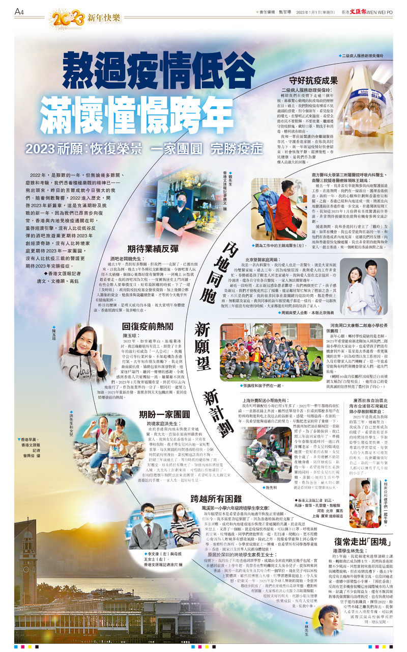 約5年前,我從福建來港修讀碩士課程,轉眼我已成為博士生,其間與香港經歷不少風雨。回想當初來港原因是這裏能與國際接軌,但在疫情洗禮下,過去3年我沒有去過海外做學術交流,也沒回過老家,遺憾中卻帶點小幸運,「困在香港」反而有更多機會接觸這座國際城市的人情味,結識了不少良師益友,還有不厭其煩教導我做實驗的助理教授,也有與我切磋空手道的教職員。揮別2022,盼疫情亦隨之離我們而去,我個人希望出入境復常後,可以到國際頂級高校做學術訪問,增長見聞。