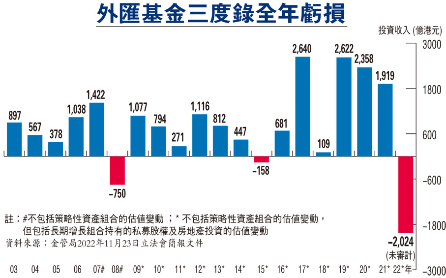 外匯基金去年投資項目全數「見紅」,其中港股投資蝕195億元,其他股票投資蝕612億元,債券投資蝕533億元,非港元資產外匯估值下調401億元,其他投資蝕283億元。不過若單計去年第4季,外匯基金投資表現明顯有較大改善,其中港股投資賺163億元,其他股票投資賺312億元,債券投資賺254億元,非港元資產外匯估值上調35億元。