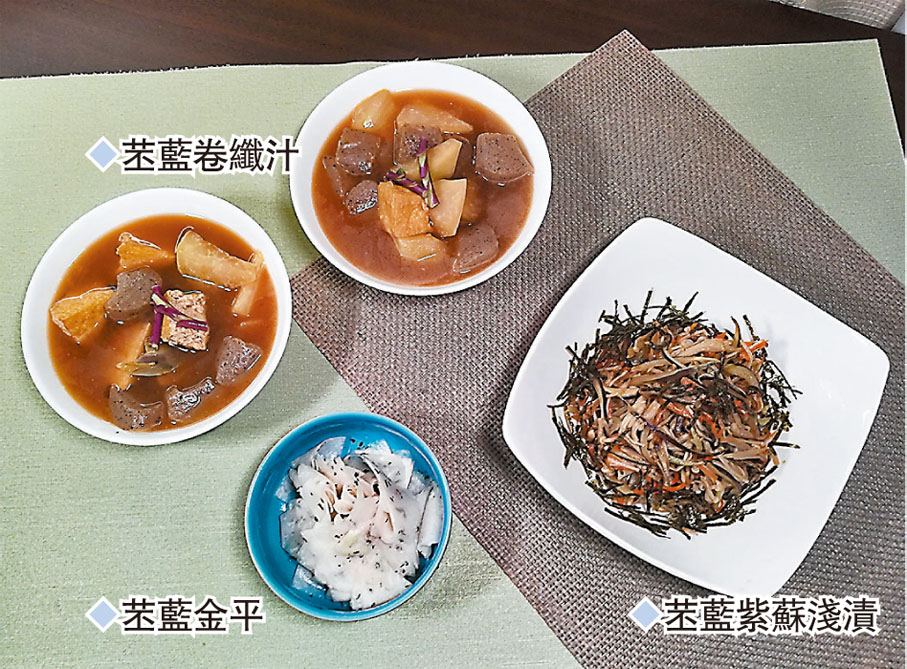 2. 20分鐘後,將碗內苤藍溢出的水分濾出,加入紫蘇飯素、醋及白醬油拌勻後浸漬20分鐘即成。