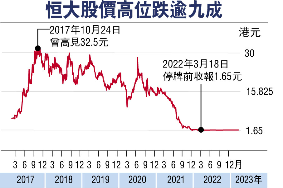 恒大集團曾經是內地最具規模的內房企業之一,惟集團因財困等問題至今停牌近一年,停牌前股價收報1.65元,與恒大股價曾在2017年達到歷史高峰的32.5元比較,股價從高位回落近95%;恒大市值亦由股價高位32.5元時的最高市值約4,291億元,大幅蒸發逾4,000億元,跌至昨日的約217.8億元。