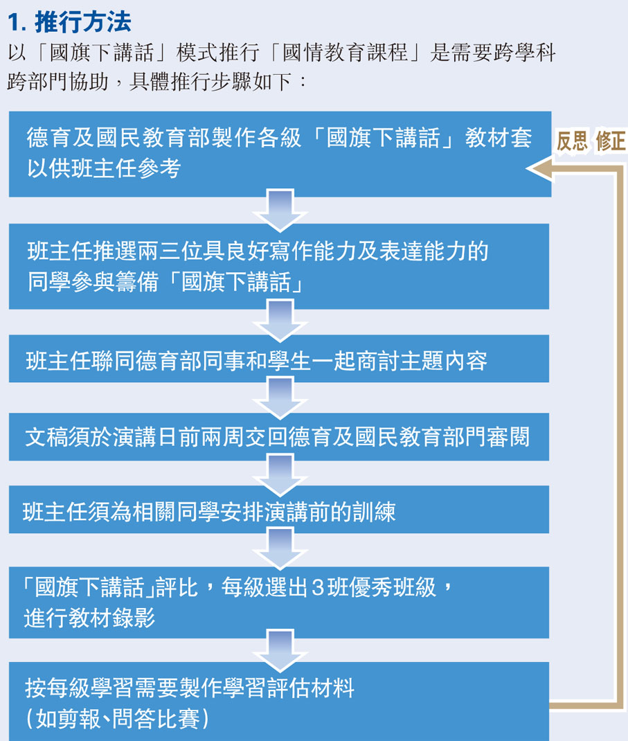 以「國旗下講話」模式推行「國情教育課程」是需要跨學科跨部門協助,具體推行步驟如下: