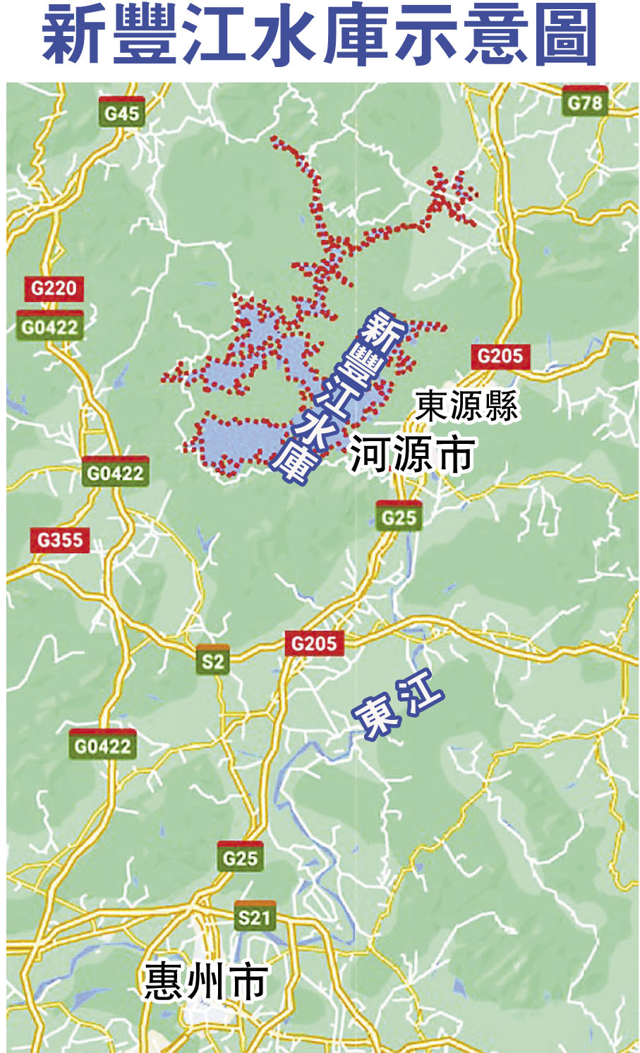 根據多年監測結果顯示,新豐江水庫水質一直達地表Ⅰ類水標準,是優質飲用水源。因為水質特別優異,新豐江水庫的水,被選為香港同胞飲用水,自東深供水工程1965年3月建成後正式向香港供水。從最初的每年對港供水0.68億立方米上升到目前8.2億立方米左右,保障了香港75%以上的用水需求。50多年來,東深供水工程累計對香港供水超過270億立方米。