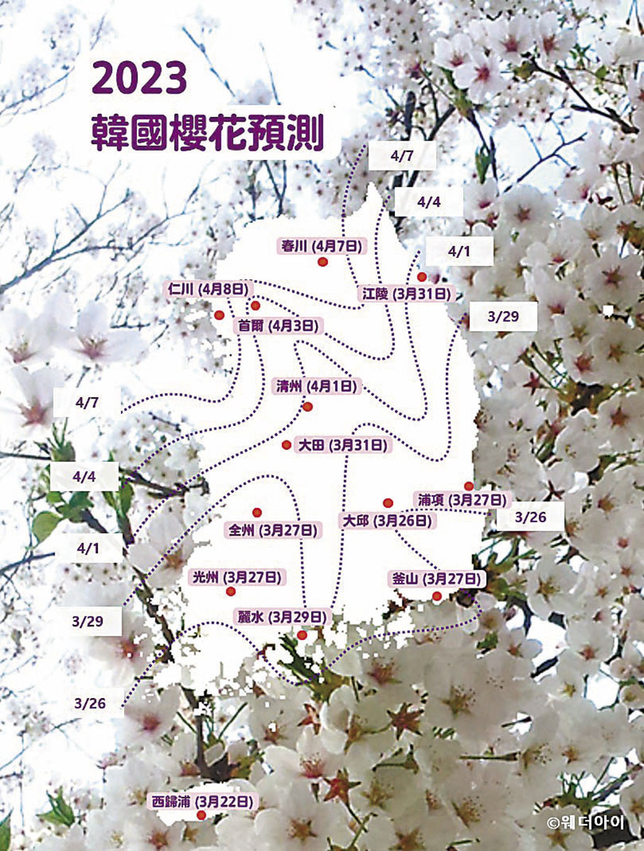 近日,民間氣象業者「Weather i」最新發布了2023年的韓國櫻花預測,指出今年櫻花開花的日子預計比往年提早1至7日。首爾預計將於4月3日開花、4月10日盛開;釜山預計將於3月27日開花、4月3日盛開;濟州西歸浦則預計將於3月22日開花、3月29日盛開。不過要留意櫻花的開花時間容易受天氣變化影響,因此可能與預計的時間有所不同。
