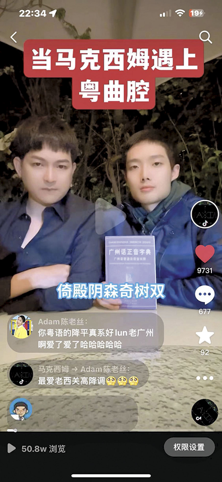 如今,短視頻平台正悄然成為粵語文化最火的地方,粵語元素已成現在短視頻爆火的財富密碼。在馬克西姆的抖音視頻下有人留言:「我前幾天聽馬克西姆老師用粵語讀《滿江紅》,有被驚艷到,打算今年在公司年會上狠狠表現一下。」 「我打算給新歌用粵語填詞,因為粵語聲調更加豐富,成曲之後的效果也會更好。」