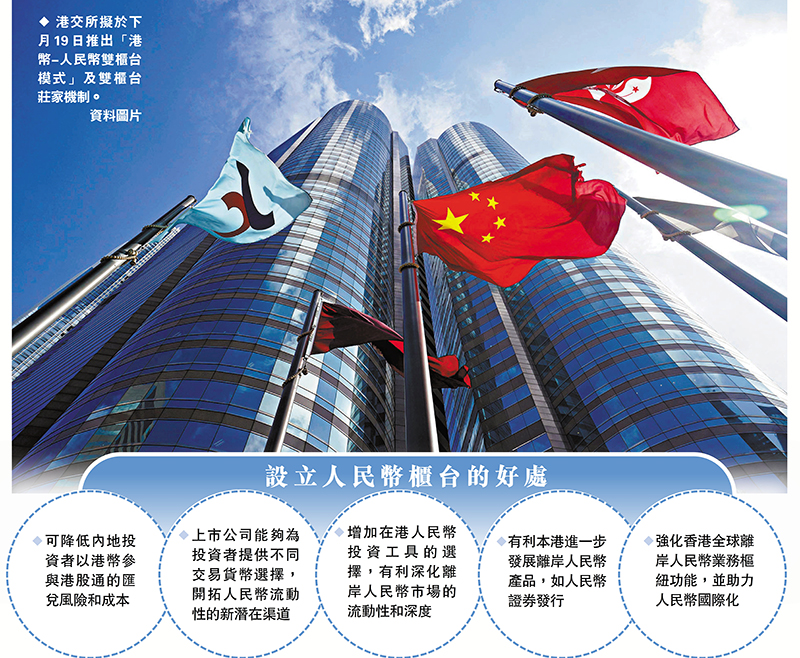 港交所(0388)昨公布擬於下月19日推出「港幣-人民幣雙櫃台模式」(雙櫃台模式)及雙櫃台莊家機制,投資者可選擇港幣或人民幣買賣相關股份。港交所行政總裁歐冠昇表示,新機制將有助推動人民幣計價證券在香港的交易及結算,豐富本港的人民幣產品生態圈,鞏固香港作為全球最大離岸人民幣中心的地位,進一步推動人民幣國際化。首批雙櫃台證券及莊家名單有待公布,不過據企業的公告,自今年3月起至今,已約有23間公司公布申請增設人民幣櫃台,當中包括不少重磅股如騰訊(0700)、阿里巴巴(9988)等,共佔港股總市值約四成。