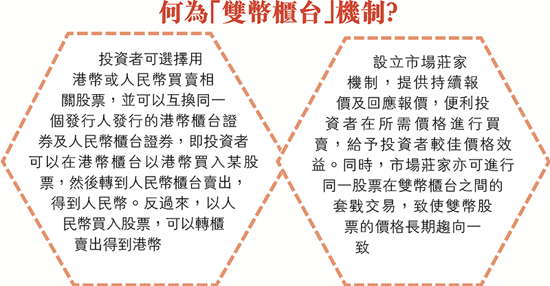 同時,上市發行人可以自行決定加入或取消其中一種幣值櫃台。至於支付股息的幣種,港交所及香港結算沒有就發行人的股息政策設立任何強制性規定,發行人可自由選擇以港幣或人民幣支付股息。