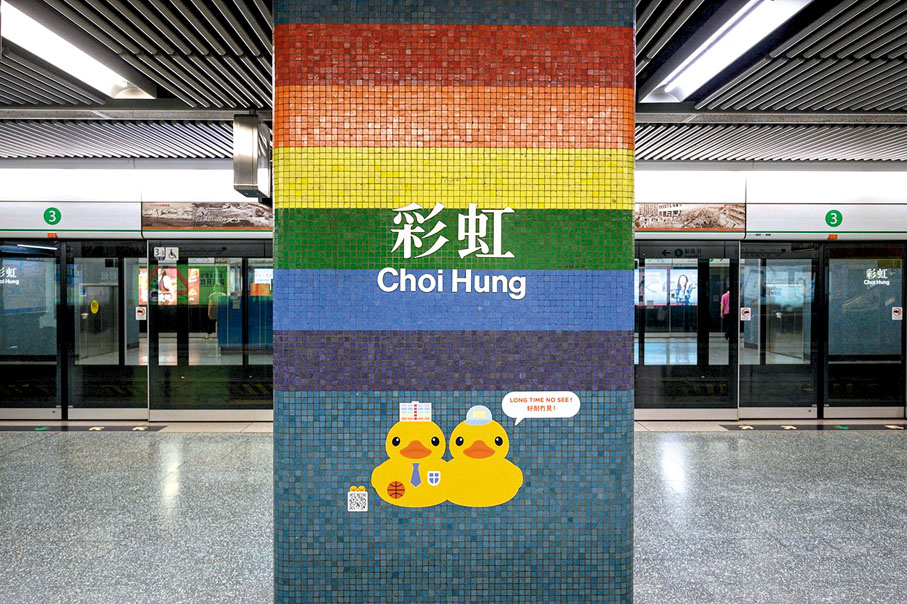 最接近展覽地點的金鐘E出口化身成「橡皮鴨主題 E出口」,包含新設計的月台地面貼紙、扶手電梯、牆身貼紙和半圓玻璃天窗,為市民綻放開心笑顏,呼應藝術家霍夫曼創作初心——以無限放大的童心,吸引繁忙都市人的目光,鼓勵乘客停下來感受和細味生活片刻。