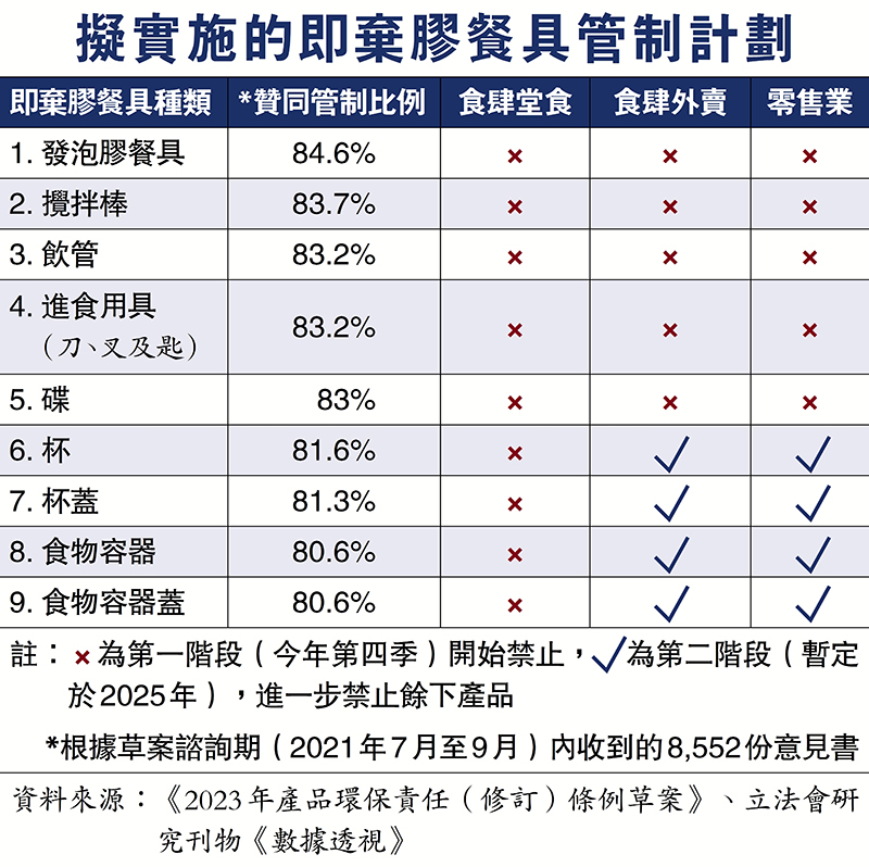 為從源頭「走塑」,特區政府向立法會提交《2023年產品環保責任(修訂)條例草案》,建議最快於今年10月禁止向堂食及外賣顧客分別提供9類及5類即棄膠餐具。草案早前獲不少議員支持,但香港文匯報記者直擊發現,要落實草案建議面臨諸多現實問題。