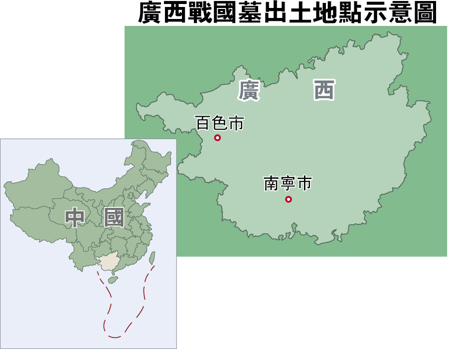 這次發現的銅鼓墓地,出土於平果市北部的紅水河支流,當地距廣西首府南寧200多公里,車程近三個小時,距平果市區80公里,不僅現在看來很偏遠,當年也是遠離政治中心和人類聚集地。由此推斷,平果墓地當年戰國時期可能屬於一個目前沒有歷史記載的小國家。