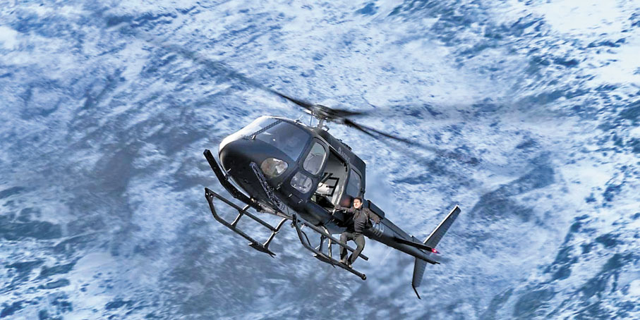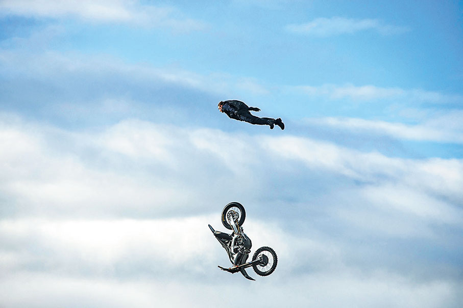 電影史上最壯觀特技場面:500次跳傘及13,000次電單車飛躍,單跳崖那場戲就經過15個月的訓練,跳傘教練對靚佬湯讚不絕口,說他的空間意識感好強,是他見過的人之中覺察力最強的!然後他們又做了個平台讓靚佬湯練習開電單車,讓他可以「輕鬆」躍過七八十呎的平台,掌握準確的時間定位,以避過嶙峋的山石。他們每日試跳30次,務求令自己像機器般準確。他們在英國一個採石場複製多個跑道,讓靚佬湯模擬跳崖,用以精確地計算怎樣可以讓攝影機及無人機設置在捕捉到靚佬湯特寫鏡頭的位置。稍有差池,大自然氣流變動,又或降傘打不開,又或是跳的時候被電單車絆倒……那可就會粉身碎骨!所有鏡頭都是靠無數次輾轉重複練習再練習,天啊!都說認真的男人最性感!可是,當這高難道的戲份成功完成後,那麼下次還要拍什麼來超越呢?!