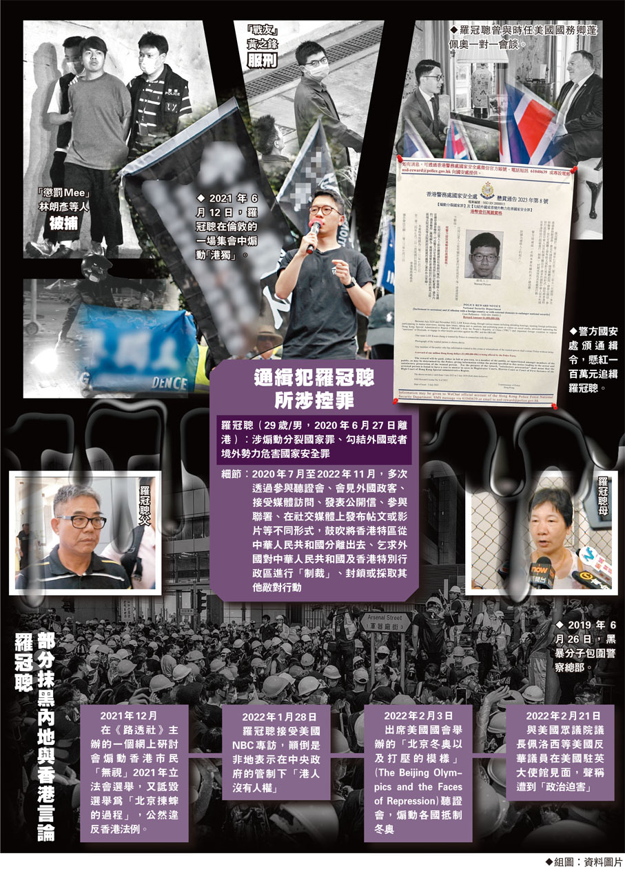 香港警方國安處上周一(3日)以涉嫌「干犯危害國家安全」等多項罪名宣布通緝竄逃海外的羅冠聰等8人。警方日前拘捕前「香港眾志」主席林朗彥等5名殘黨,揭發他們營運「懲罰Mee」網購平台打造所謂「黃色經濟圈」,從中資助逃犯羅冠聰。昨日,國安警再到羅冠聰於東涌的舊居及其父親住所搜查,並將其父母和兄長帶署錄取口供,但未採取拘捕行動。特區行政長官李家超強調,警方目前已就相關懸紅收到一些資料,會加強調查力度,對通緝犯及幕後支持或控制他們的力量窮追猛打。 ◆香港文匯報記者 蕭景源