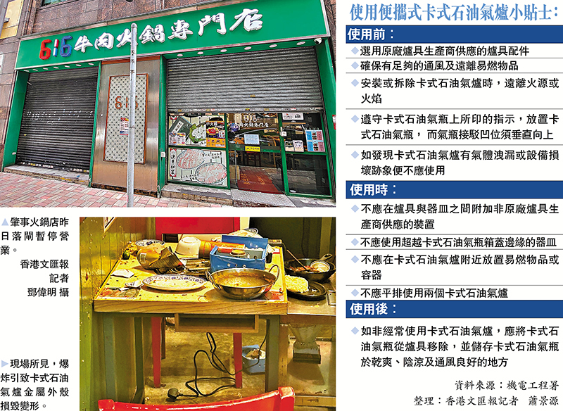香港文匯報訊(記者 蕭景源)灣仔616牛肉火鍋專門店,昨日在午市期間發生卡式石油氣爐爆炸傷人意外。一對食客享用一人一鍋打邊爐時,其中一個卡式石油氣爐突然發生爆炸,碎片四濺,擊傷兩人,鄰座一名女食客被巨響震到耳鳴,同需送院治理。機電工程署調查發現,該兩個手提卡式石油氣爐在桌上平排使用,懷疑因使用不當導致卡式石油氣瓶過熱發生爆炸,而涉事手提卡式石油氣爐未獲機電署批准而沒有「GU」標誌,涉嫌違反《氣體安全條例》,署方會調查及跟進。