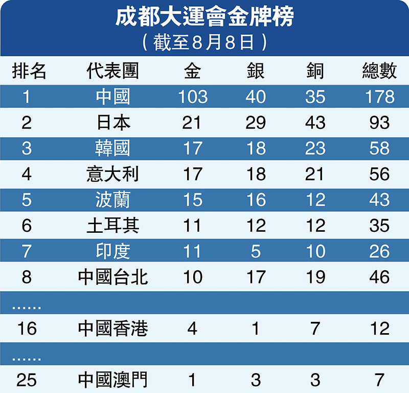 今屆大運會全部18個大項有269枚金牌產生,共有35個代表團獲得金牌、53個代表團拿到獎牌。其中,日本(21金)、韓國(17金)、意大利(17金)、波蘭(15金)、土耳其(11金)、印度(11金)、中國台北(10金)分別位居金牌榜的第2至8位。中國香港代表團和中國澳門代表團,分別以4金1銀7銅和1金3銀3銅的成績,位居金牌榜的第16位和第25位。
