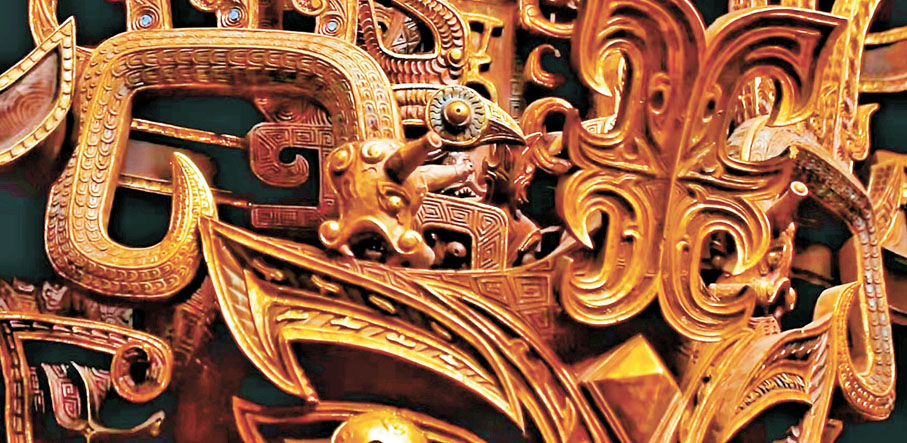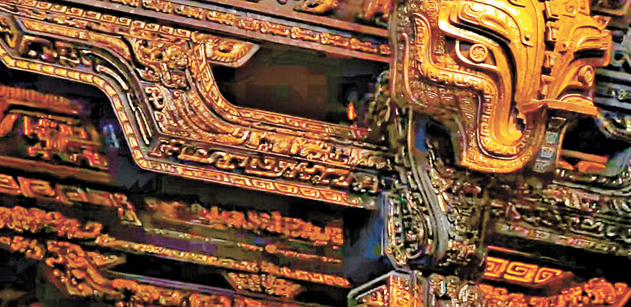 大殿內,商王背後有一面巨大的屏風,外觀參考了上古史相關文獻中的紋樣,採用了殷商圖騰饕餮,以及「玄鳥生商」和三十一代商王的歷史故事,由浙江東陽木雕、安徽歙縣木雕等「非遺」傳承人來共同完成。