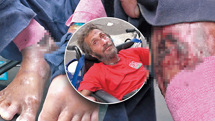 在肯辛頓的露天毒品市場,吸毒者當街用針頭給自己注射,身上滿是滲血的傷口,鮮血從手臂上流下。吸毒者吉恩(圖)說,他剛出院,之前在不知情的情況下服用了賽拉嗪。他的腿上纏着繃帶,覆蓋着多處損傷。