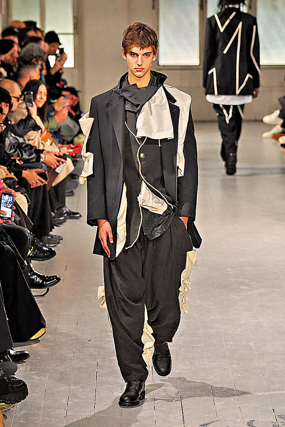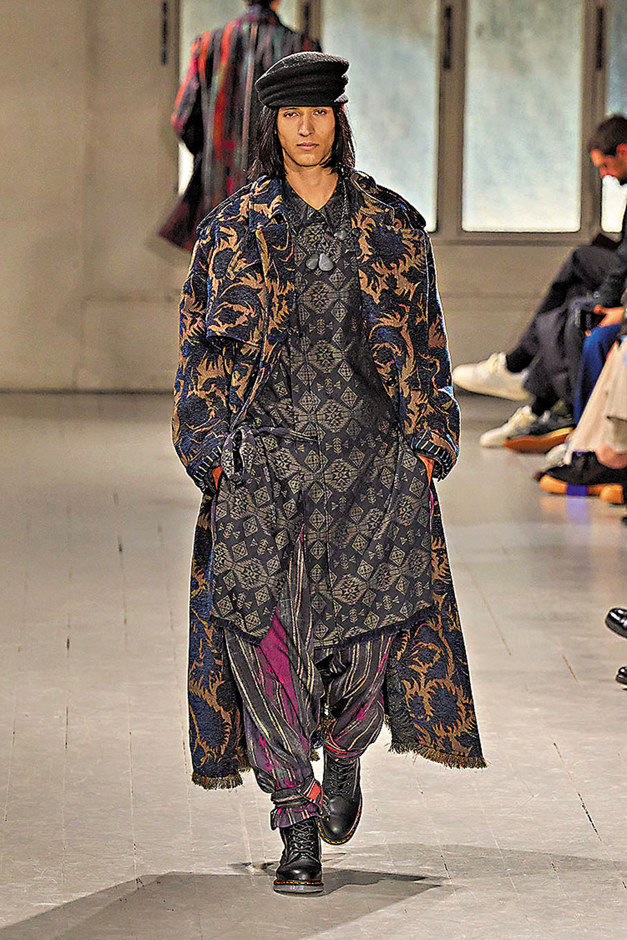 今年,Yohji Yamamoto 2023秋冬男裝系列,沿着絲綢之路的旅程,裁縫以精細複雜的融合、多彩圖案與潤飾的層疊,重新詮釋了這個經過古典時代與中世紀歐洲文明和語言大熔爐洗禮的文化寶藏。其布料技術的巔峰之作是開發出雙面布料,它可在外套、褲子和大衣分別兩次印上不同的紮染圖案,展示出亞洲和歐洲文化之間的結合。
