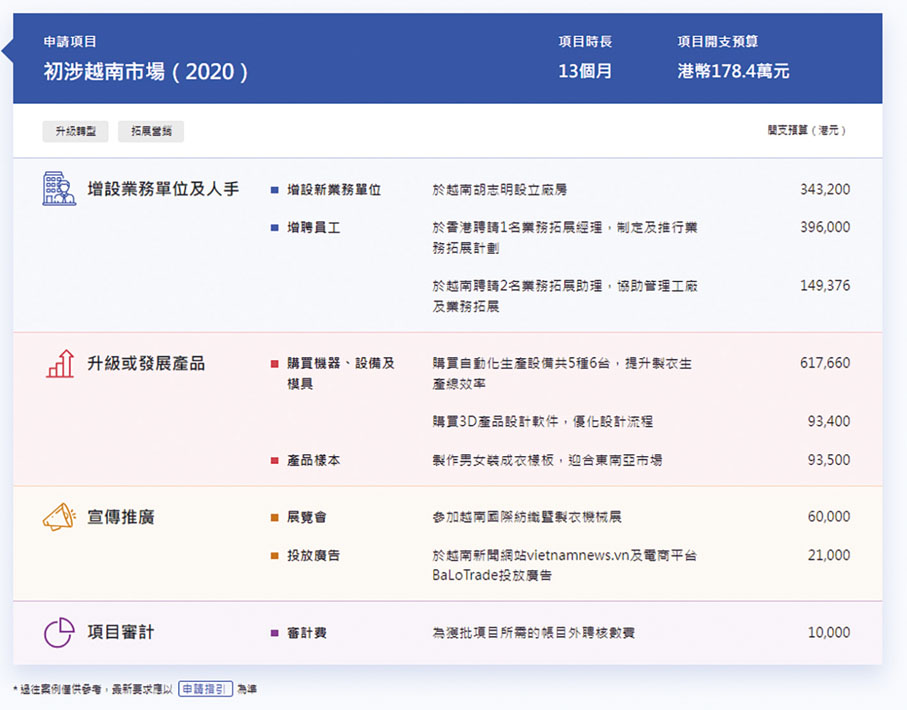 「BUD專項基金」適用於各行各業將業務流程升級轉型,以下就是受益於這一資助計劃的案例:企業從事紡織品OEM生產及銷售,在內地設有工廠。由於東南亞的需求和機遇逐漸增多,企業決定將生產線由內地逐漸轉移至越南,並加以產品宣傳推廣,來打開東南亞市場。