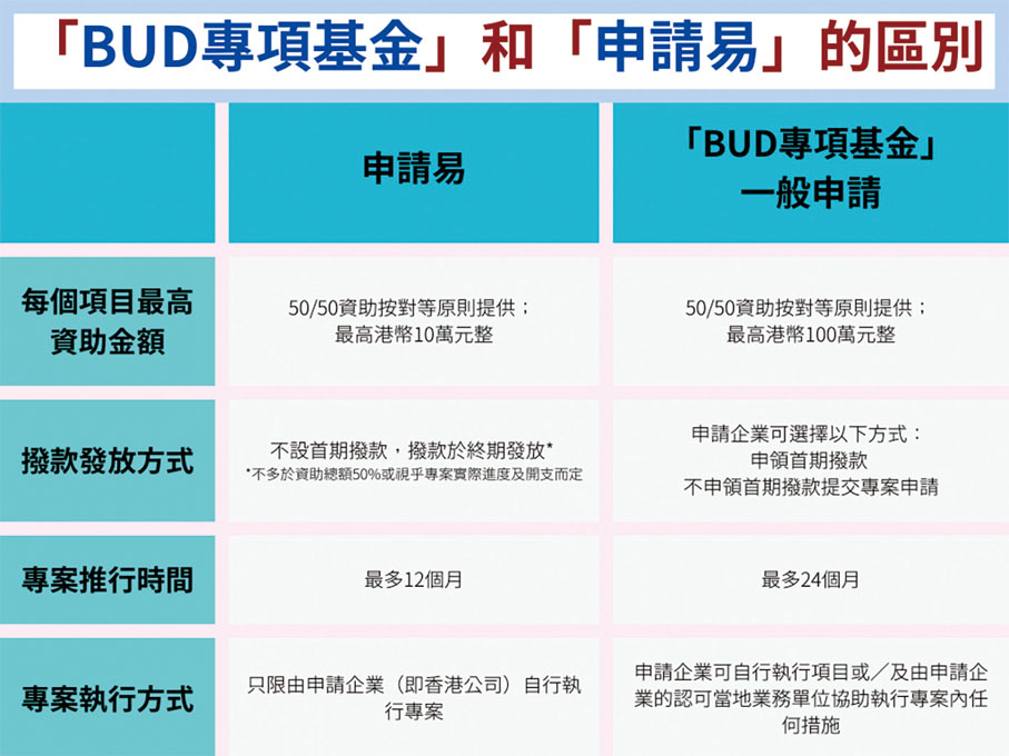 全新推出的「申請易」簡化了BUD專項基金申請表格和所須遞交證明檔的要求及審批程式,讓中小企業更好掌握疫後復蘇的商機。相比起「BUD專項基金」,「申請易」每項申請的處理時間也減半至30個工作日內完成(以收齊填妥的申請表格、所需證明檔及生產力局所需的澄清資料起計)。