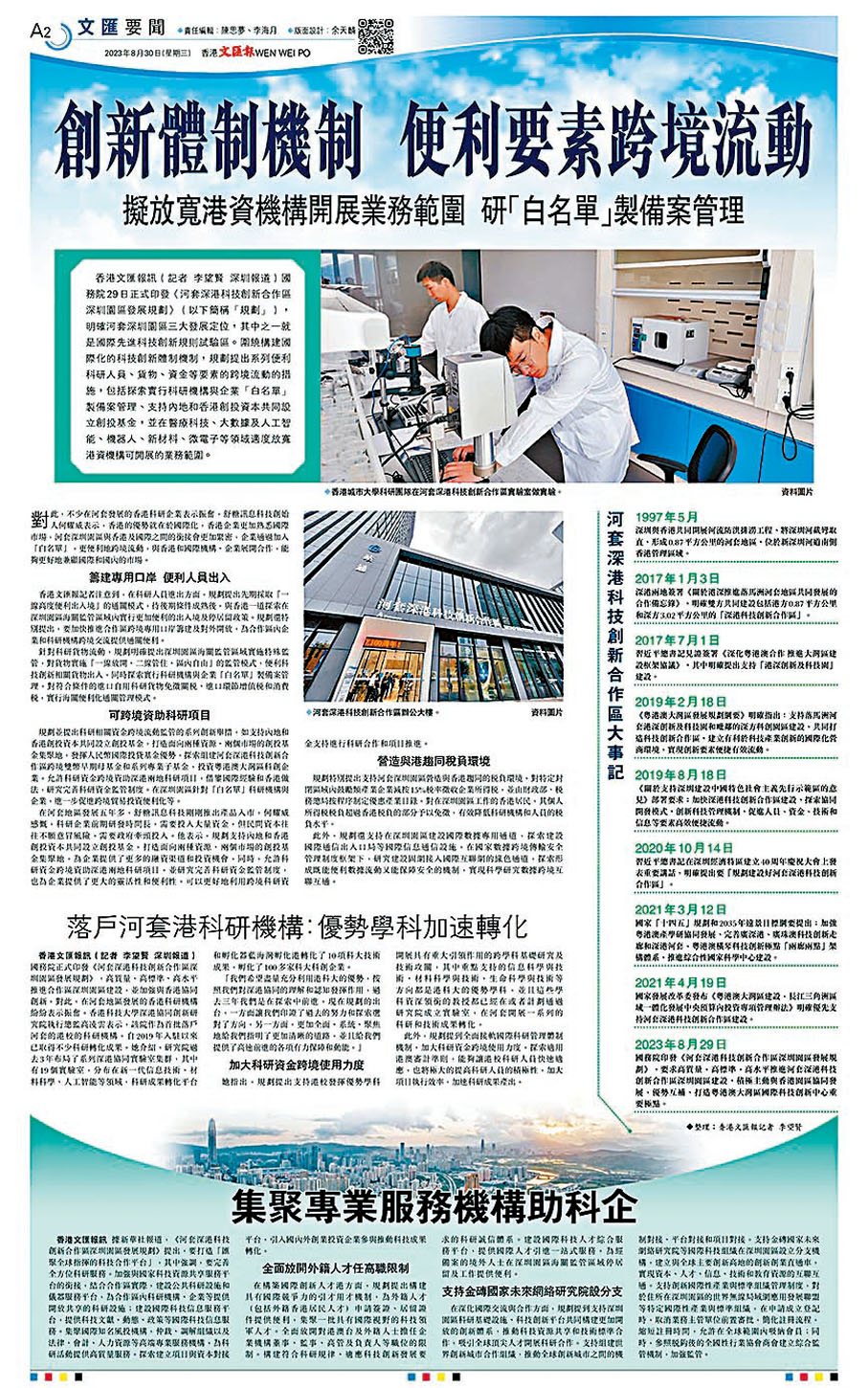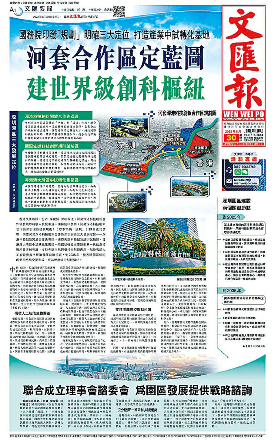 今年8月29日,國務院正式公布《河套深港科技創新合作區深圳園區發展規劃》,明確了該園區的三大發展定位——深港科技創新開放合作先導區、國際先進科技創新規則試驗區、粵港澳大灣區中試轉化集聚區。規劃一公布,隨即受到內地、香港甚至國際社會的廣泛關注。為讓香港社會各界更容易明白該河套合作區的內涵、香港打造國際創科中心的意義,以及對香港經濟發展帶來的巨大動能,香港文匯報翌日特別用了三個版的篇幅,圖文並茂地從多個方面進行解讀,既有宏觀介紹,也有微觀事例;既有專家解讀,也有業界看法。可以說,有關報道也是香港文匯報在「說好中國故事、說好香港故事」方面的其中一個最佳事例。