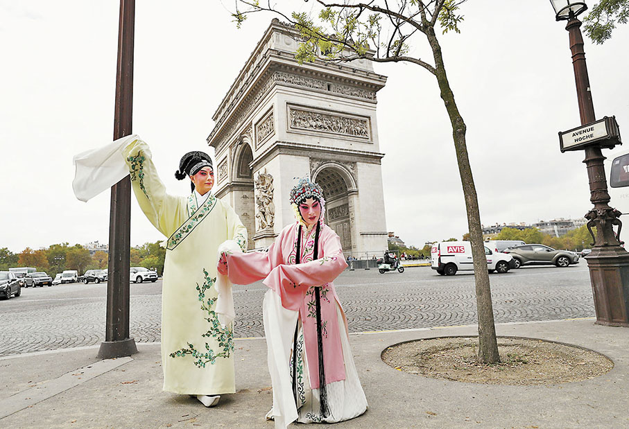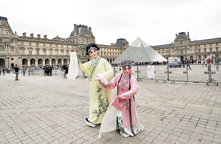 作為「文明遇·鑒:中國昆曲江蘇周」系列活動之一,江蘇省演藝集團昆劇院院長施夏明、江蘇省演藝集團昆劇院國家一級演員孔愛萍走上巴黎街頭,在著名地標建築前以「快閃」的方式展示昆曲藝術。