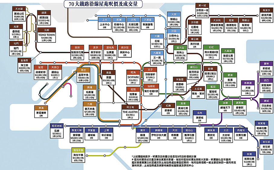 根據統計數字,70大鐵路沿線屋苑之中,共有58個屋苑呎價錄得不變或下跌,其中下跌屋苑佔27個,跌幅最大為清水灣道8號以及天晉,分別按月跌14%及13%,而上車指標屋苑嘉莊山莊則按月跌8%,呎價9,000元,為70大鐵路沿線屋苑唯一呎價跌穿一萬元之屋苑。呎價上升之屋苑只有12個,其中以寶翠園及匯璽升幅最大,分別按月升14%及10%。