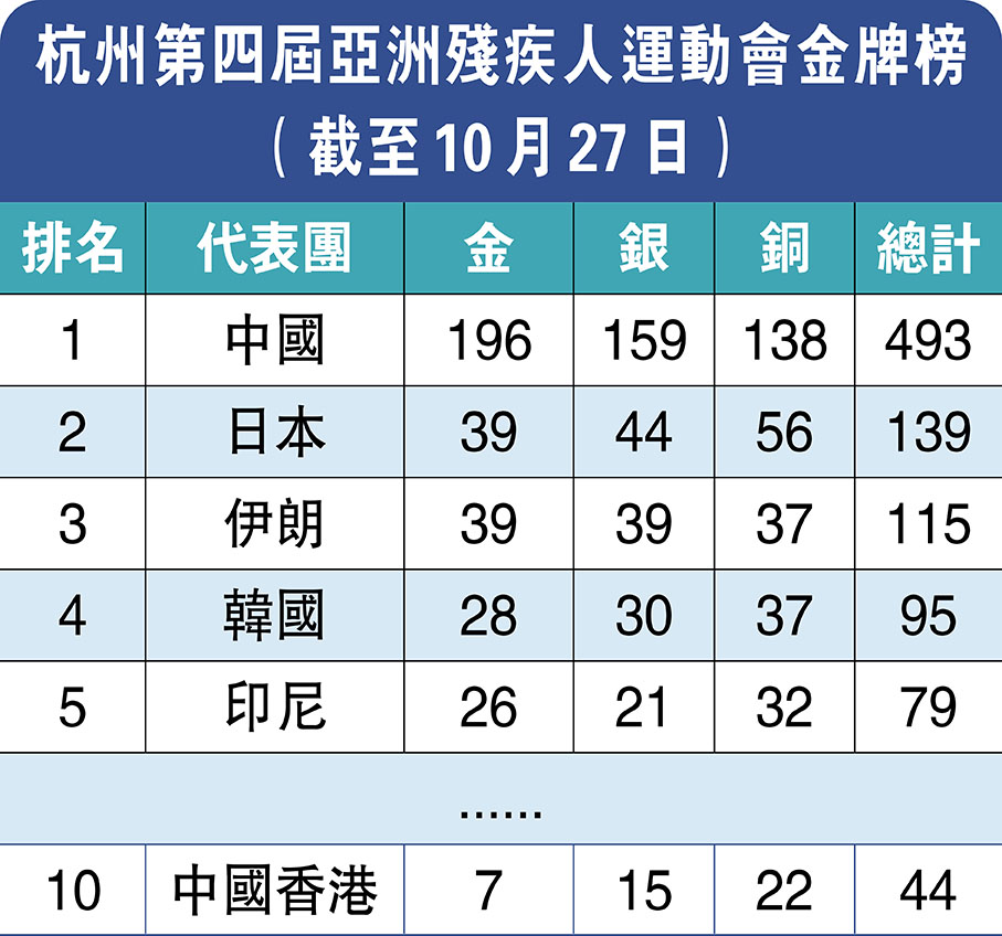 杭州第四屆亞殘運會經過過去9日的較量,今晚便降下帷幕。中國香港代表團昨日憑藉朱文佳在羽毛球項目及李志明/鄧順儀在草地滾球比賽再添兩金,其中69歲的鄧順儀更成為本屆亞殘運會年紀最大的金牌獲得者。 ◆香港文匯報記者 陳曉莉