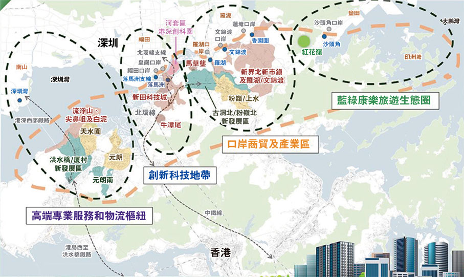 至於「高端專業服務和物流樞紐」則位於「北部都會區」的西部,包括元朗和天水圍新市鎮,以及正動工的洪水橋/厦村新發展區(洪水橋/厦村)和元朗南,和規劃中的流浮山/尖鼻咀/白泥一帶(流浮山)等。