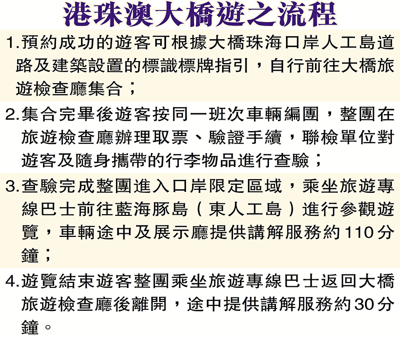 「港珠澳大橋遊全程遊覽時間約140分鐘。」珠海九洲控股集團副總經理李文軍介紹,預約成功的遊客可根據大橋珠海公路口岸人工島相關指引,自行前往大橋旅遊檢查廳集合,查驗完成整團進入口岸限定區域;乘坐旅遊專線巴士前往「藍海豚島」進行參觀遊覽,車輛途中及展示廳提供講解服務約110分鐘;遊覽結束遊客整團乘坐旅遊專線巴士返回大橋旅遊檢查廳後離開,途中提供講解服務約30分鐘。港珠澳大橋海關關長黃向榮表示,由於大橋旅遊區域位置較為特殊,遊客要配合海關工作人員對行李物品進行檢查,目前島上未設置免稅商店。