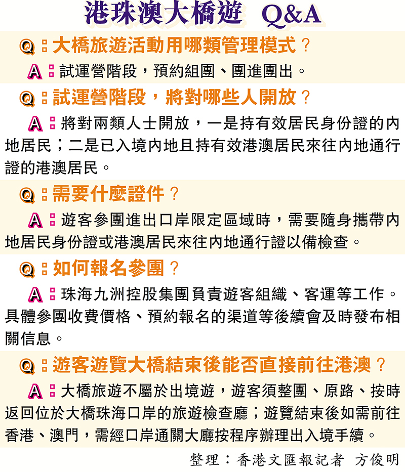 珠海出入境邊防檢查總站港珠澳大橋邊檢站政委林美紅表示,試運營階段,大橋旅遊將對兩類人士開放,一是持有效居民身份證的內地居民;二是已入境內地且持有效港澳居民來往內地通行證(回鄉證)的港澳居民。遊客參團進出口岸限定區域時,需要隨身攜帶上述規定證件以備檢查。還值得注意的是,大橋旅遊不屬於出境遊,遊客須整團、原路、按時返回旅遊檢查廳,遊覽結束後如需前往香港、澳門,需經口岸通關大廳按程序辦理出入境手續。