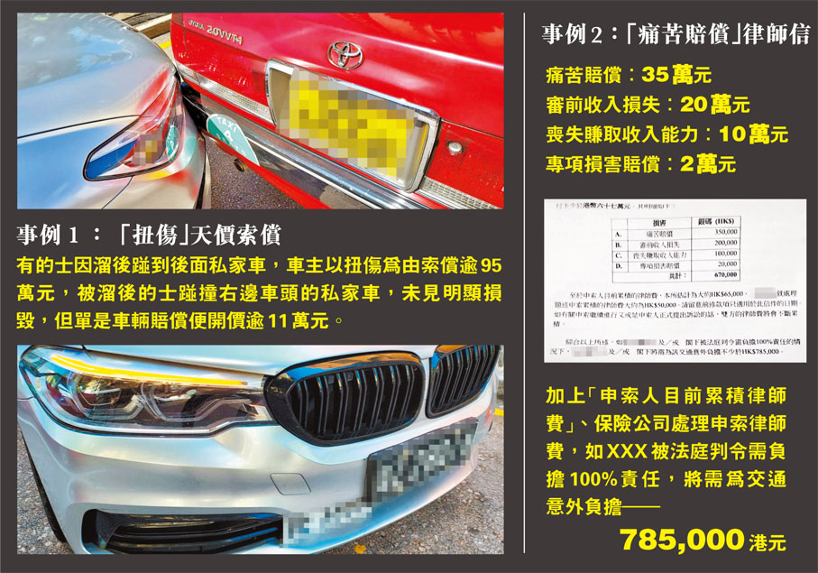 他透露,有的士司機2021年11月在葵涌一個路口溜後,車尾輕微撞到隨後的寶馬私家車。的士車尾劃花僅用250元維修,但報稱商人的後車車主6個月後入稟索償95.6萬多元,聲稱事故中扭傷頸背,計算病假6個月收入損失、痛苦賠償、汽車損毀和購買補品等各項開支,開出高昂賠償額。