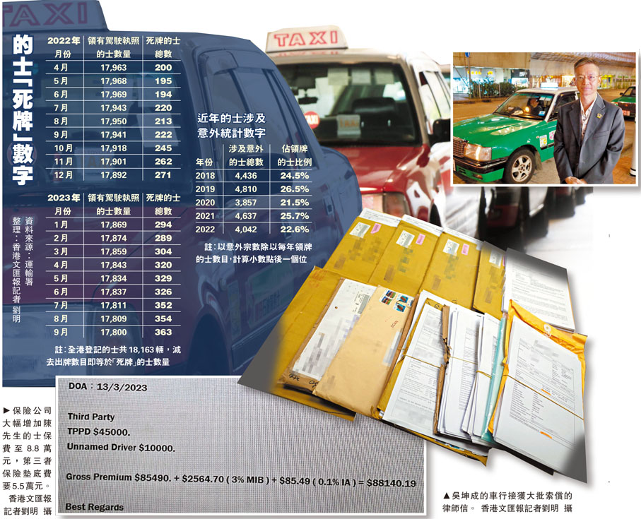 吳坤成向香港文匯報表示,的士在發生交通意外後的翌年保費會大幅上升,甚至不獲續保,手尾甚長,故不少私家車車主以此為把柄,逼令的士車主接受天價賠償,「架車(維修可能)三四萬元,私家車開到七萬元至十萬元賠償。的士車主怕續保難,焗住畀,如果和解唔到,私家車司機就話自己受傷搵律師天價索償,加上保險公司的後續懲罰性保費,的士車主肉隨砧板上。」