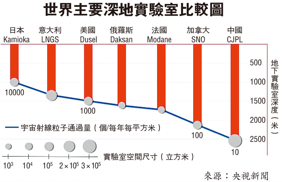據介紹,與國際上其他深地實驗室相比(見表),錦屏地下實驗室岩石覆蓋最深、可用空間最大、宇宙線通量最小。2,400米厚的岩石,有效阻擋了宇宙射線,使得該實驗室的宇宙線通量是地面的億分之一,為開展暗物質探測提供了近乎絕對「安靜」的實驗條件。