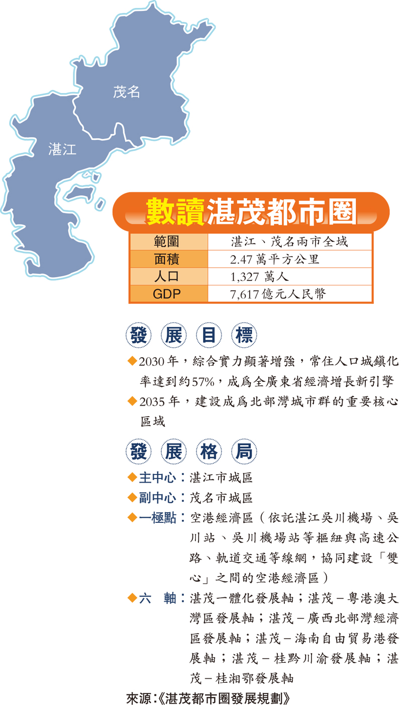 廣東湛江和茂名坐擁中國南部最大海灣,又被譽為「粵西雙子星」。由它們共同組成的「湛茂都市圈」,對內東連粵港澳大灣區、南接海南自由貿易港、北通成渝雙城經濟圈,聯動多個國家重大戰略區域;對外與越南最近港口僅158海里航程,是中國對接東南亞最近的出海口,是鏈接大西南和東盟的樞紐。近日廣東省政府推出的《湛茂都市圈發展規劃》(下稱《規劃》)提出,湛茂都市圈將構建「粵港澳-西南-東盟」物流大通道,加密對東盟國家海外航線,成為中國西南出口東盟重要樞紐。按照規劃,湛茂都市圈有望在2030年成為廣東經濟增長新引擎。 ◆香港文匯報記者 盧靜怡 廣東報道