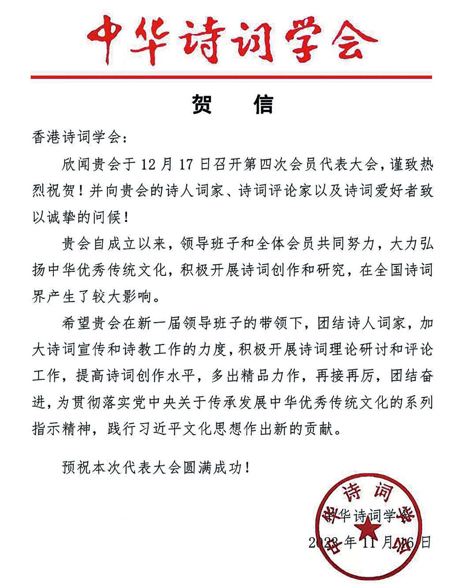 很遺憾未能出席香港詩詞學會第四屆會員代表大會。我委托中華詩詞學會常務副會長林峰和副會長沈華維及主任秦軍代表中華詩詞學會向大會召開表示熱烈的祝賀!向與會代表表示誠摯的問候!
