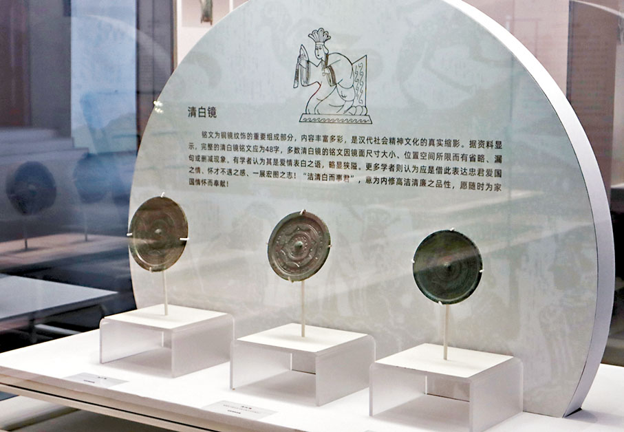 本次展覽展出的漢代「清白鏡」,鑄有精美的圖案紋飾和內容豐富的銘文;文字古樸多樣,意為內修高潔清廉之品性,願隨時為家國情懷而奉獻,不僅具有很強的時代特徵,亦有極高的文化欣賞和文字研究價值,是漢代社會精神文化的真實縮影。而 「規矩鏡」鏡背分布規矩紋,將「規」和「矩」設在鏡中,不僅寓意每日持鏡檢視自身、三省吾身、涵養規矩意識,警示為官者「時時勤拂拭 勿使惹塵埃」,同時也體現了「沒有規矩不成方圓」亙古不變的道理。