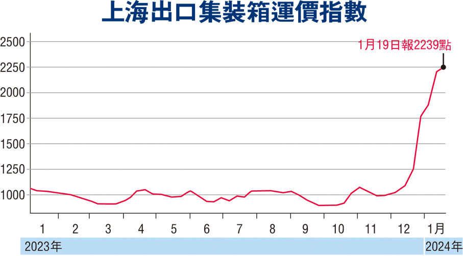 紅海緊張局勢加劇,大量國際班輪只得繞行南非好望角,令交貨時間和運費成本均大幅上升,海運價格不斷上漲。截至1月19日,上海出口集裝箱運價指數已逼近2,250點,較去年12月增長逾倍。班輪運貨時間拉長也影響空櫃返回,空櫃越來越緊缺,目前從深圳前往歐洲的40英呎貨櫃運費飆升至5,200美元,漲幅約1.5倍,而繞道好望角還令原來約19天的航程,增加了12至15天。海運費用高漲令很多內地出口商叫苦不迭,而更令人擔心的是紅海危機或觸發歐美更多「近岸採購」,令處於逆風的中國製造業進一步受壓。◆香港文匯報記者 李昌鴻 深圳報道