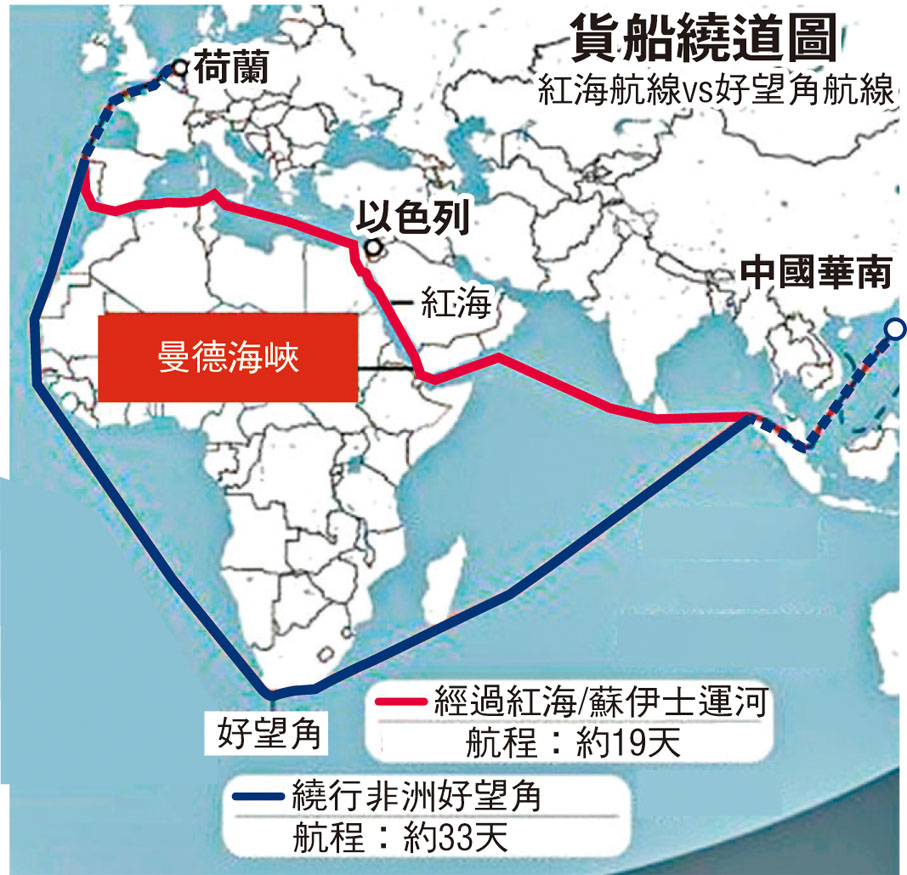 紅海局勢觸發貨運危機 商船紛繞道 航程長兩周 運費漲逾倍