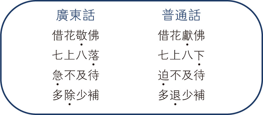廣東話和普通話很多固定詞語是一樣的,但也有一些有「一、兩字之別」、「詞序之別」或在衍化過程中各有所取。