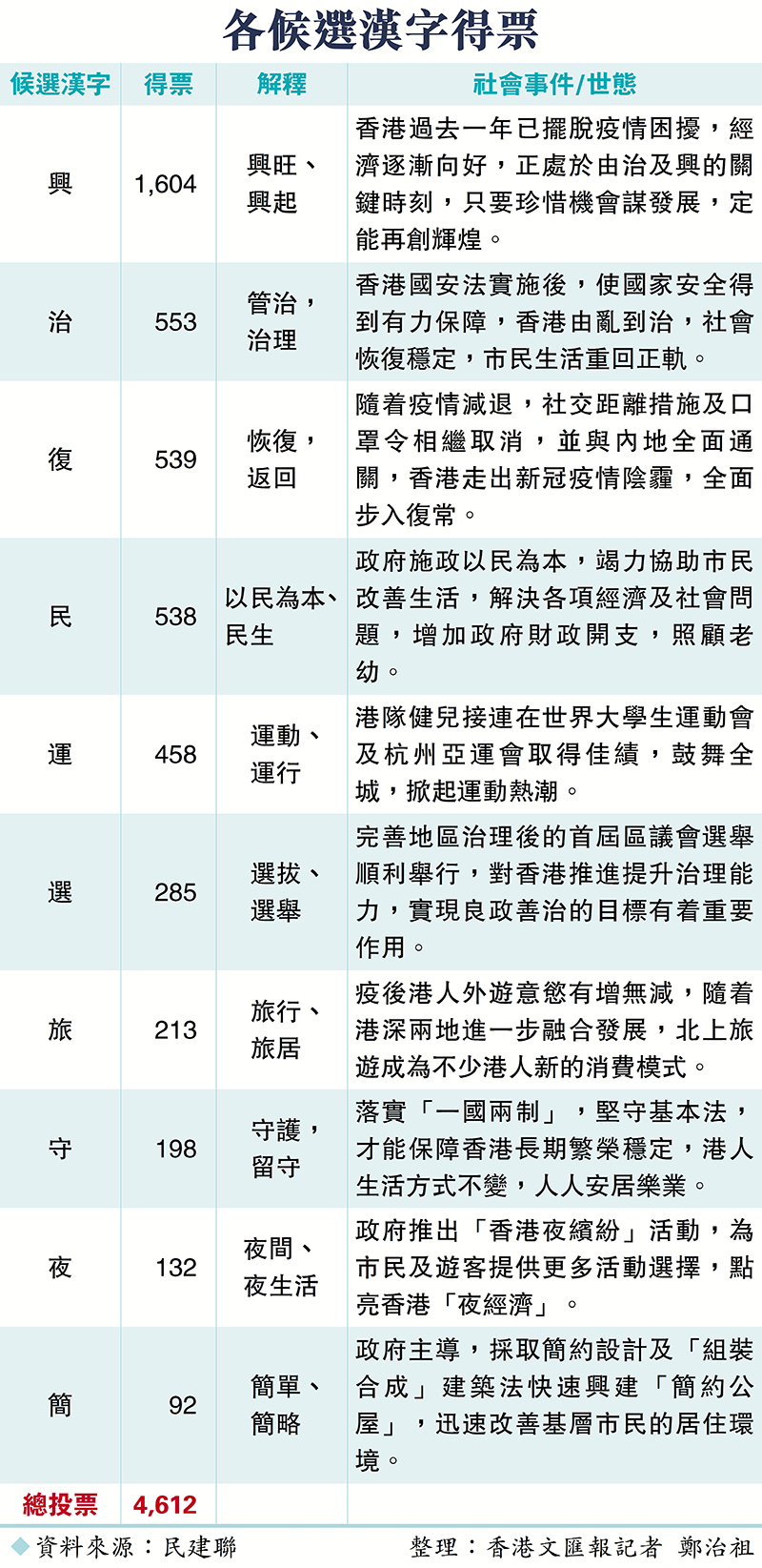 ◆民建聯昨日公布當選的年度漢字及投票情況,「興」當選為2023年「香港年度漢字」。