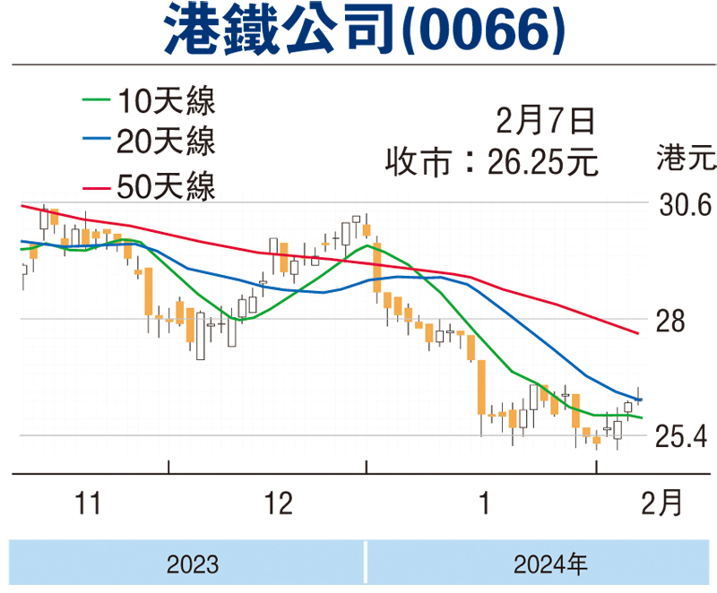港鐵早前公布,經內地鐵路部門與港鐵商討後,廣深港高鐵服務將於2月11日至13日,即年初二至初四期間,每日增加11對 ,即22班往來香港西九龍站及福田站的高鐵列車班次,每日列車班次增加至105對。料有望增加集團的車務收入。近日集團股價在25.1元水平靠穩,近日更在金融科技系統出現信號,可予留意。(筆者為證監會持牌人士,無持有上述股份,並為個人意見。)