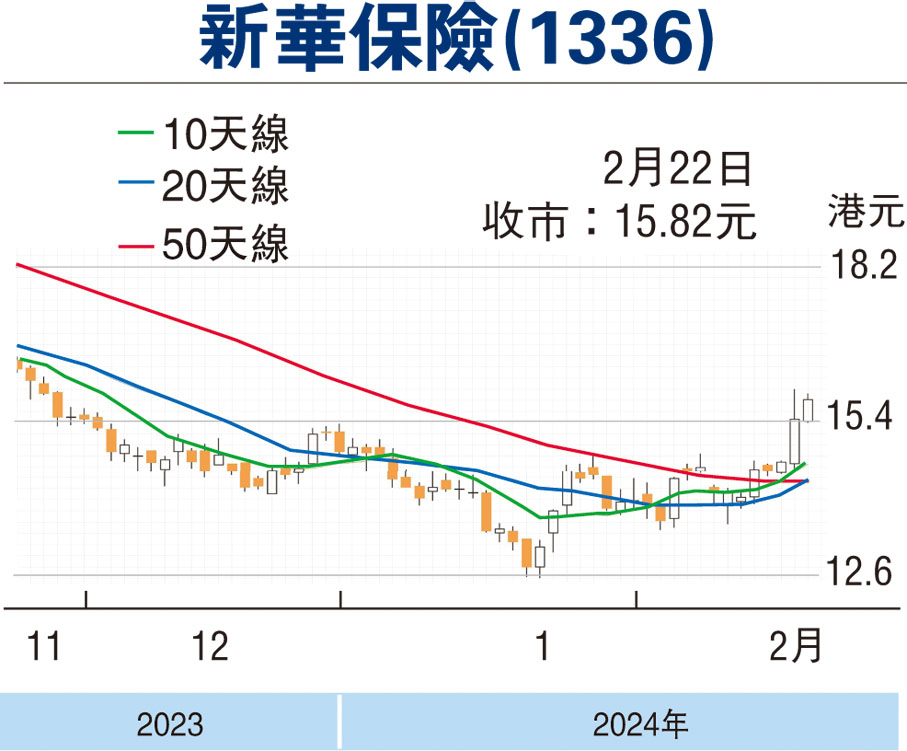 新華保險上月公告,2023年全年累計原保險保費收入為1,659.03億元,按年增加1.72%。日前並公布,公司於今年1月底原保險保費收入約298.9億元,按年減少15.04%。新華保險昨收報15.82元(港元,下同),升0.26元或2.3%,成交1.06億元。該股自1月底12.60元52周低位回升,技術上已收復10天、20天及50天線,走勢強。現價市盈率4.45倍,息率7.7厘,市賬率0.43倍,估值不貴,可遇回調收集,上望17元水平,跌穿14.40元止蝕。