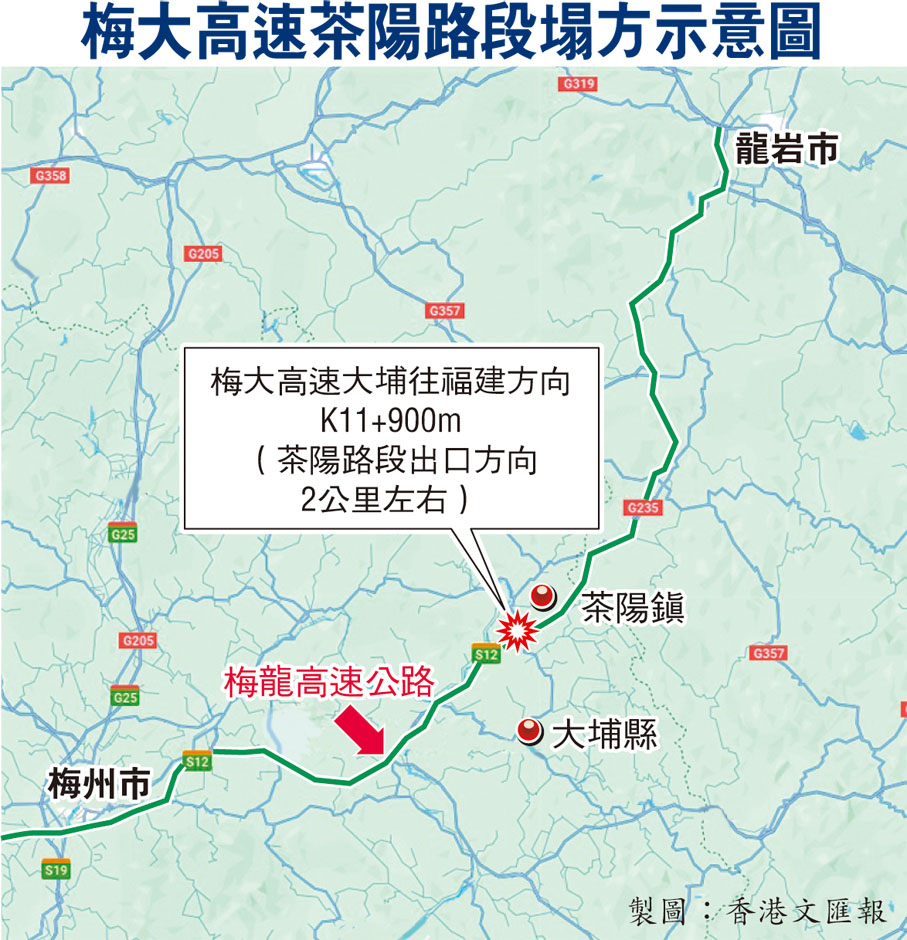 塌方事故發生在梅大高速梅州市大埔縣往福建方向,位於茶陽路段出口方向2公里左右。從現場照片可以看到,事發點位於多座山坡之間,高速公路兩側均有落差較大的坡度。香港文匯報記者從事發現場照片看到,發生事故的梅大高速公路為雙向四車道,往福建方向的兩條車道已經全部坍塌,無行車空間。香港文匯報記者從網友現場拍攝的照片看到,塌方後,事故現場的車輛如「疊羅漢」一樣堆積在一起,多數已經被燒成骨架。根據官方通報,公路塌方路面長約17.9米,面積約184.3平方米。