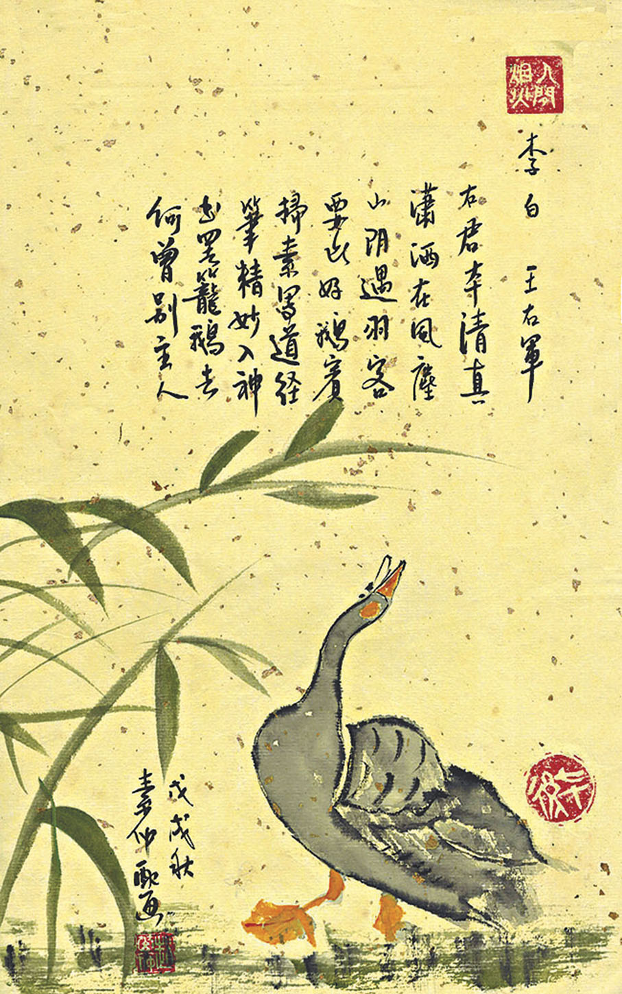 王右軍即王羲之,他是鼎鼎大名的書法家,李白敬重他,並把王羲之以書法換鵝的風雅事以詩記之。王羲之以書換鵝,潮州有馳名的滷鵝。有一年到杭州,街上許多店舖賣鴨脖子,想到鵝頸(也就是鵝脖子)被視為下酒的佳品。因鵝脖子長,經常要扭曲運動,故此,下酒乃為極受劉伶喜愛。