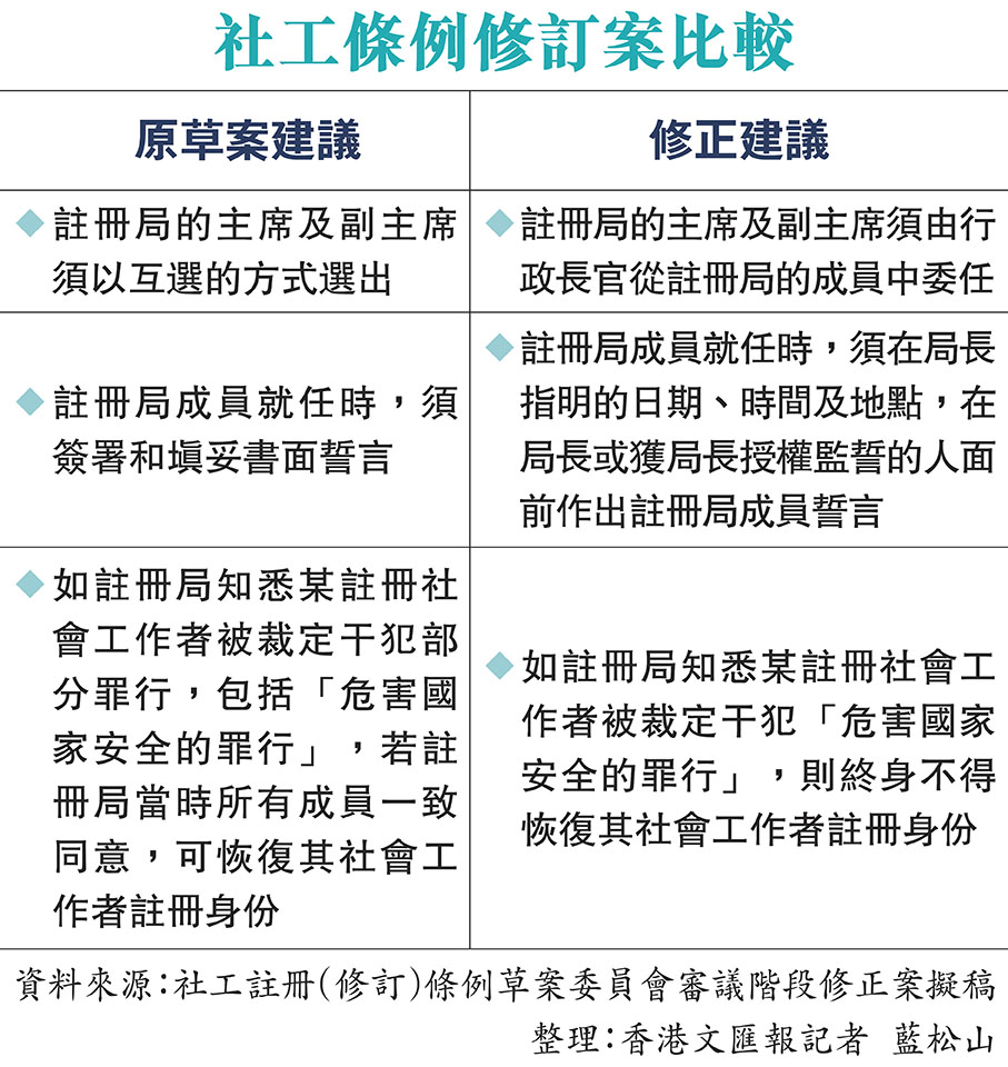 針對現時《社會工作者註冊條例》附表2,干犯「危害國家安全的罪行」的社工在續牌或申請成為社工時,如按原規定,即若註冊局所有27位成員一致同意,可例外讓其成為社工。特區政府就此提出修訂,新訂附表2A,只載列「危害國家安全的罪行」這項罪行,若干犯此罪的人士終身不得做社工,不設「逃生門」。