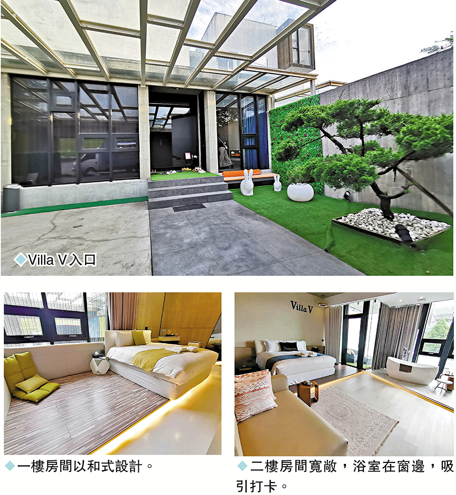 會館共四間房型,如VIP頂級雙人房、Relaxed雙人房及Star星光四人房等,10人包棟,採私人招待所模式,只接待一組客人,最多可加人到14人。館內設施有泳池水畔日光躺椅、Villa V戶外沙發區、庭院戶外野餐區、170米長河流河道、170米落羽松造景、私人後院綠地及景觀、多功能休閒池、戶外看星台、酒吧、戶外BBQ及戶外廚房DIY等。