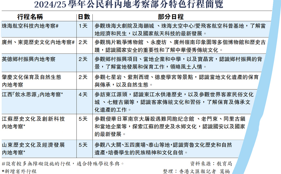 香港特區政府教育局昨日向全港中學發出通函,公布2024/25新學年的公民與社會發展科內地考察最新安排,行程由2023/24學年的26個增至28個,一天團進一步減至兩個,並新增三個4天至5天的廣東省外行程,分別前往江西省、江蘇省和山東省。配合公民科課程內容,學生有機會進一步認識東江水的源頭,有關供港歷史和兩地密切關係,以及江南的水鄉文化和保育工作,和儒家思想和齊魯文化,提升民族精神和文化自信。局方今年又會彈性安排6個適合特殊學校學生參加的行程,展示香港教育共融特色。 ◆香港文匯報記者 金文博
