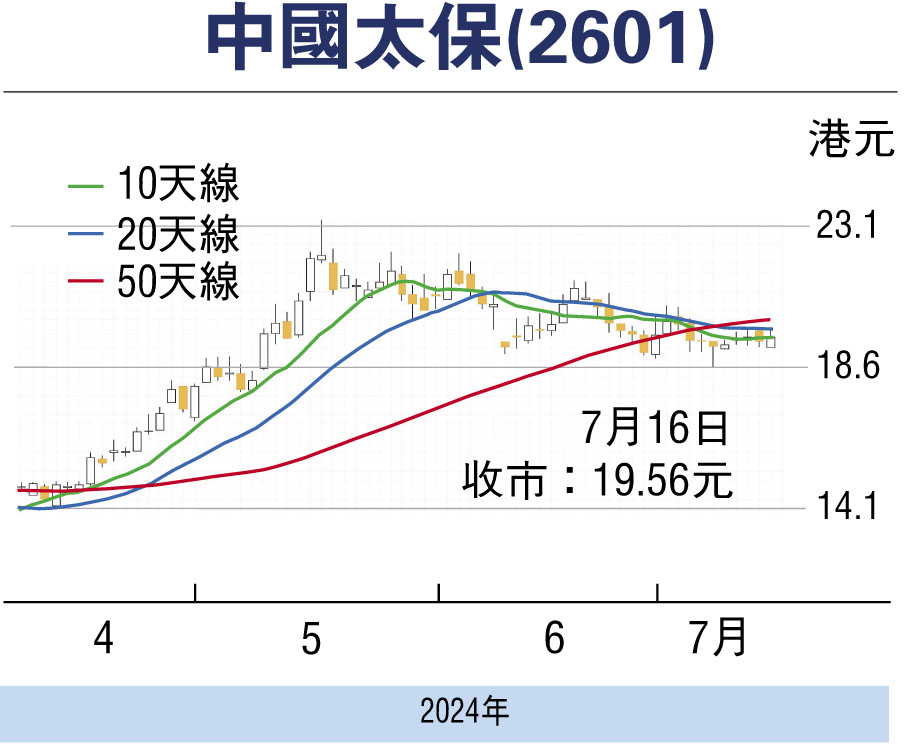 中國太保昨收報19.56元(港元,下同),升0.14元或0.72%,成交1,370萬元。該股在5月上旬攀上23.30元的52周高位後回落調整,上周二跌至18.58元獲承接,其間累跌20%。該股昨天重上10天線,有利上試20天線19.82元、50天線20.11元阻力。現價市盈率6.31倍,息率5.72厘,市賬率0.69倍,估值吸引,可跟進,上望23.3元,跌穿18.5元止蝕。