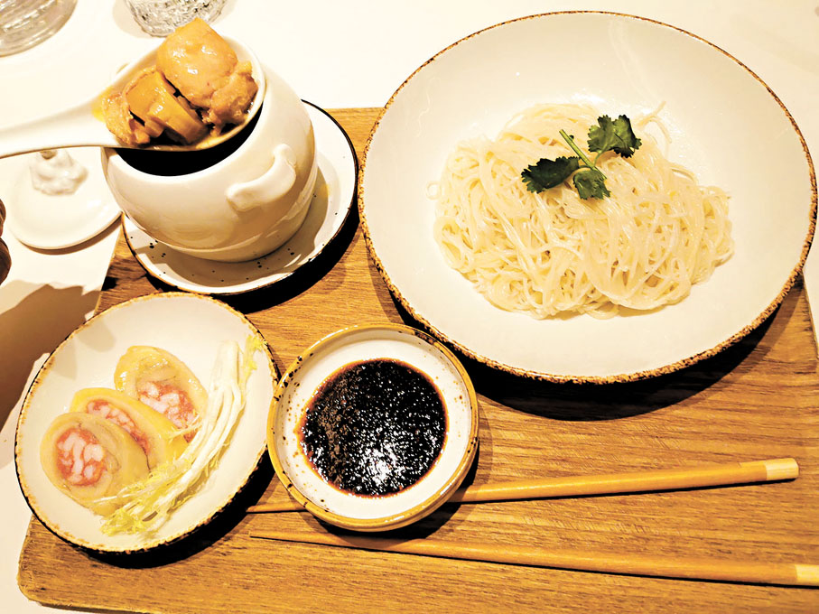 而且,餐廳還有新推出的窩蛋黃花魚銀針粉、魚味濃郁及肉質細滑的黃花魚,配上煙韌銀針粉,加上蛋黃的甘香。黃花魚湯煮哆頭蟶,用上福建特產的哆頭蟶,鮮甜多汁。甜品則有椰奶銀牙燉桃膠,晶瑩通透的桃膠、銀耳及滑溜的椰奶,非常滋潤﹔枇杷凍,解膩,清新又健康﹔白茶流心丸,外面好脆,入面流心奶黃。