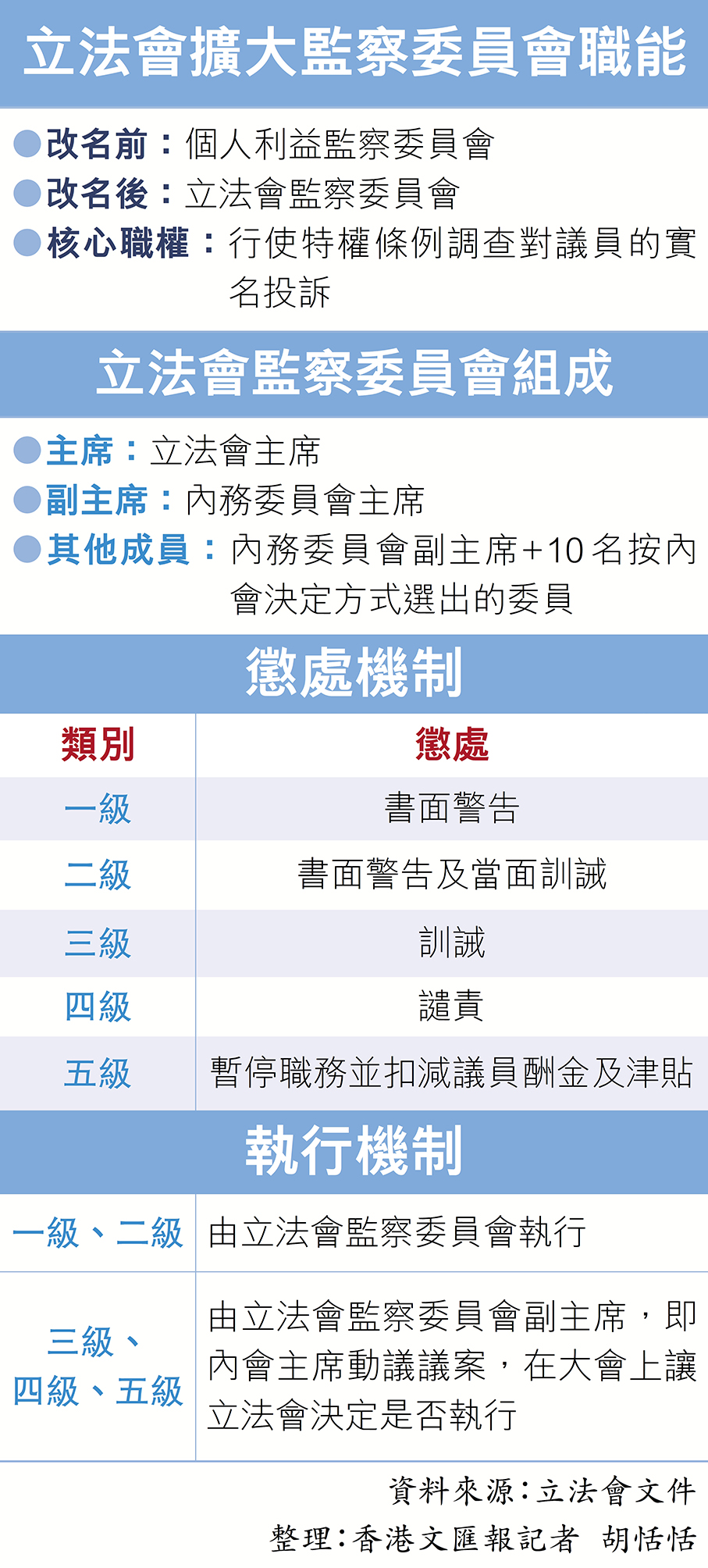 守則並引入按議員不當行為嚴重程度而釐定的處分機制,並優化議員利益申報機制等。對議員的處分包括書面警告、書面警告及當面訓誡,或由立法會通過議案訓誡、譴責或暫停議員職務。暫停職務期間無權收取議員酬金及津貼。