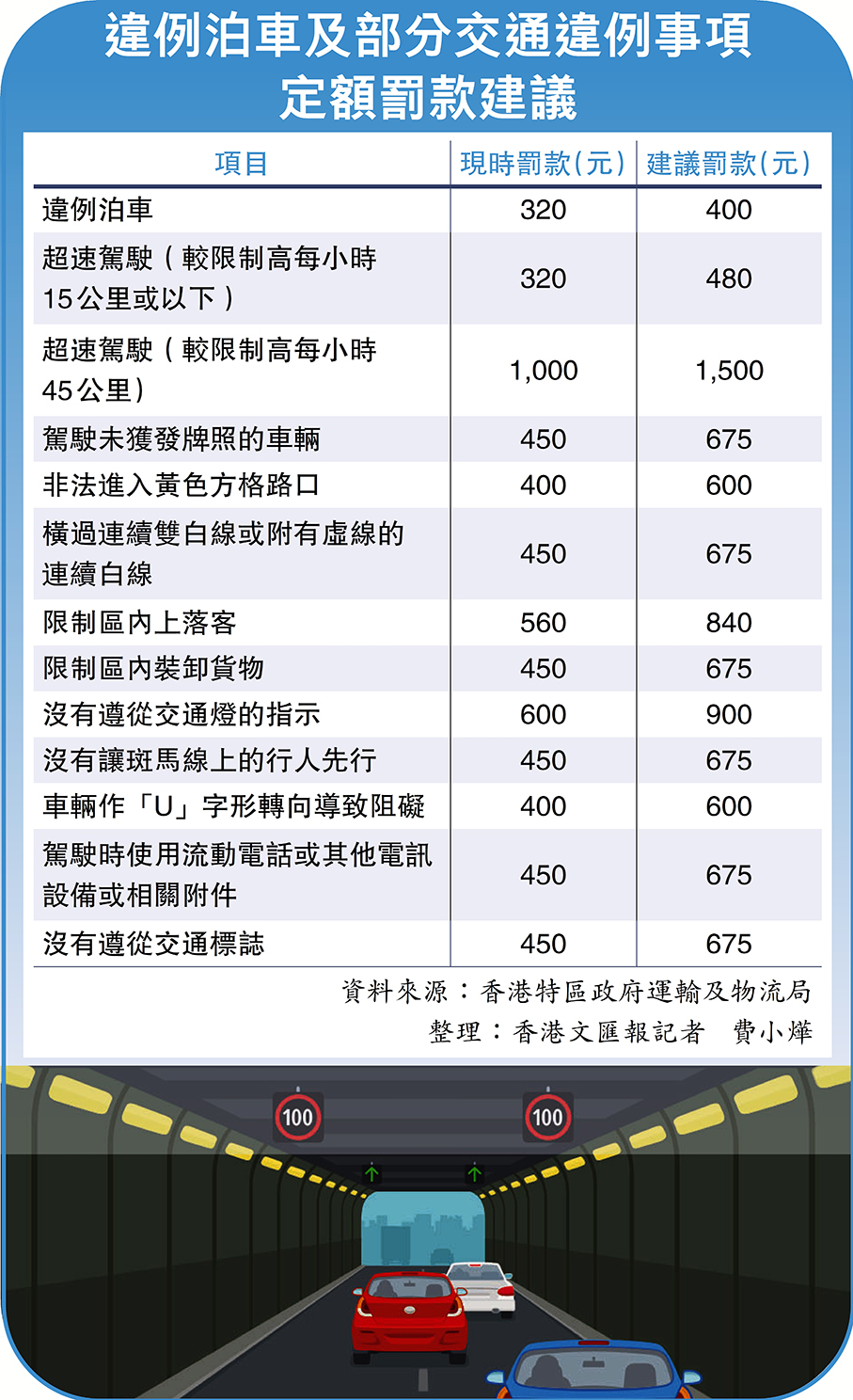 香港文匯報訊 (記者 蔡學怡)香港特區政府建議上調數項多年未曾調整的交通收費和定額罰款,其中俗稱「牛肉乾」的違例泊車定額罰款將由320元加至400元,其他與道路安全和交通擠塞相關的19項違例事項(見表)各調高50%,當中超速逾每小時45公里的定額罰款由1,000元增至1,500元,以加強保障交通安全與交通暢順。相關條例將以先審議後訂立的程序作修訂,運輸及物流局局長將於本月30日的立法會會議上提出相關動議。新定額罰款將於立法會通過決議後的半年內生效,預計於明年1月1日生效。